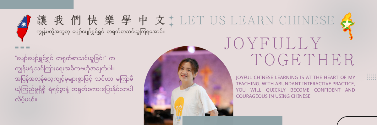 ကျွန်မက တစ်ဆင့်ပြီးတစ်ဆင့် သင့်ကို လမ်းညွှန်ပေးသွားမှာဖြစ်ပြီးတရုတ်စာလေ့လာရတဲ့ပျော်ရွှင်မှုကိုခံစားစေမှာဖြစ်ပါတယ်။